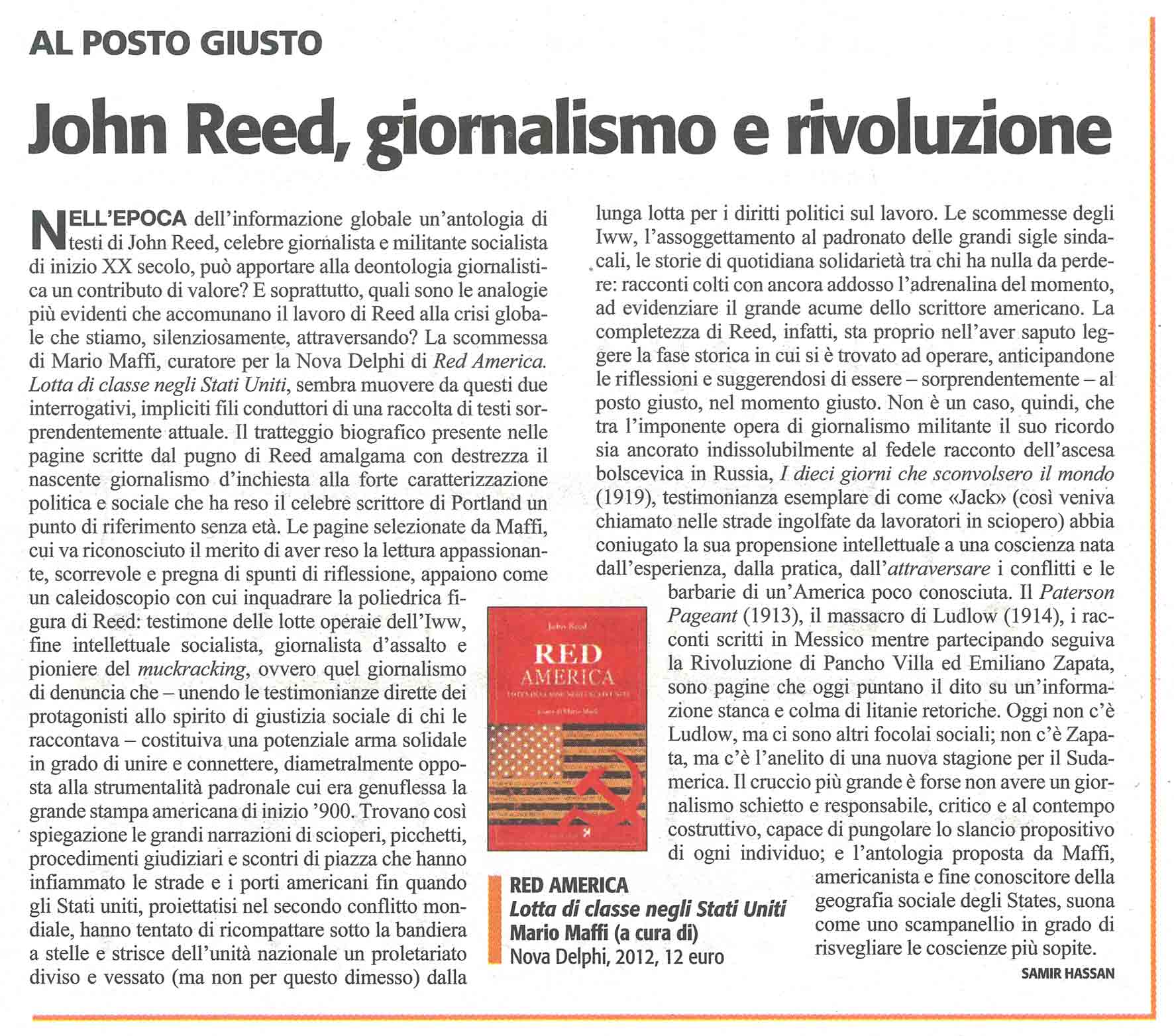 Conosciamo John Reed essenzialmente per il libro I dieci giorni che sconvolsero il mondo (1919) – l’appassionato reportage sulla Rivoluzione d’Ottobre che Lenin stesso raccomandò “agli operai di tutto il mondo”. Meno note sono la precedente, intensa attività giornalistica e pubblicistica di Reed e, negli ultimi anni di una vita brevissima (morirà a 33 anni), la sua decisa militanza nel movimento comunista statunitense e internazionale. Ciò che colpisce di questo percorso è l’intensità con cui si sviluppò nell’arco di poco meno di un decennio: segno di tempi caratterizzati da grandi sommovimenti sociali, in cui gruppi e individui erano proiettati su una scena storica segnata da straordinarie contraddizioni e profonde mutazioni. I reportage e i racconti riuniti in questo volume (alcuni inediti in Italia, altri pubblicati una quarantina d’anni fa ma ormai introvabili) danno la misura del violento scontro sociale che interessò gli Stati Uniti all’inizio del Novecento e sono stati scelti, all’interno di una copiosa produzione, perché ne rappresentano sicuramente la testimonianza più vibrante ed eloquente, contribuendo a delineare la figura di un uomo che divenne il modello per un’intera generazione di intellettuali statunitensi.
