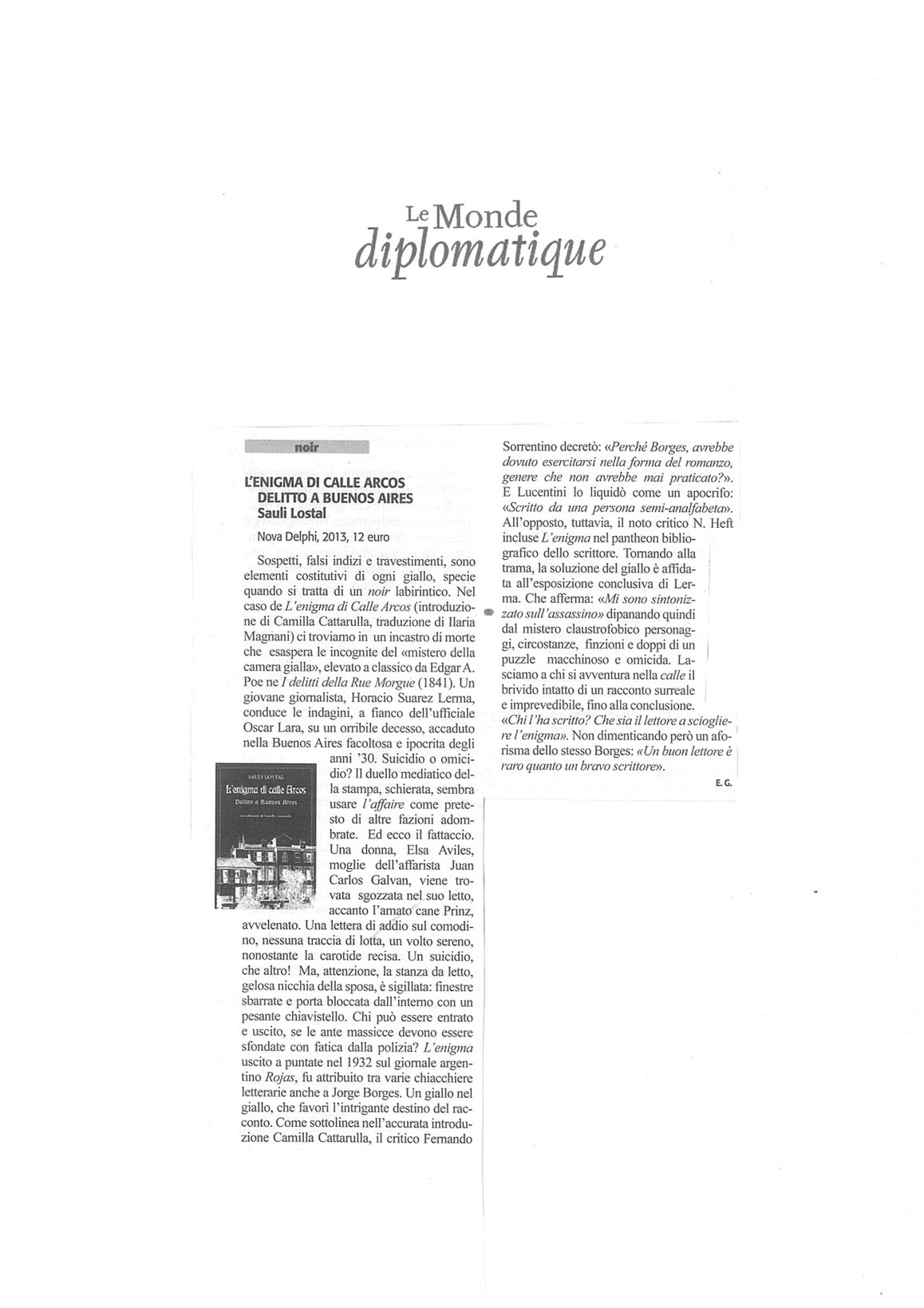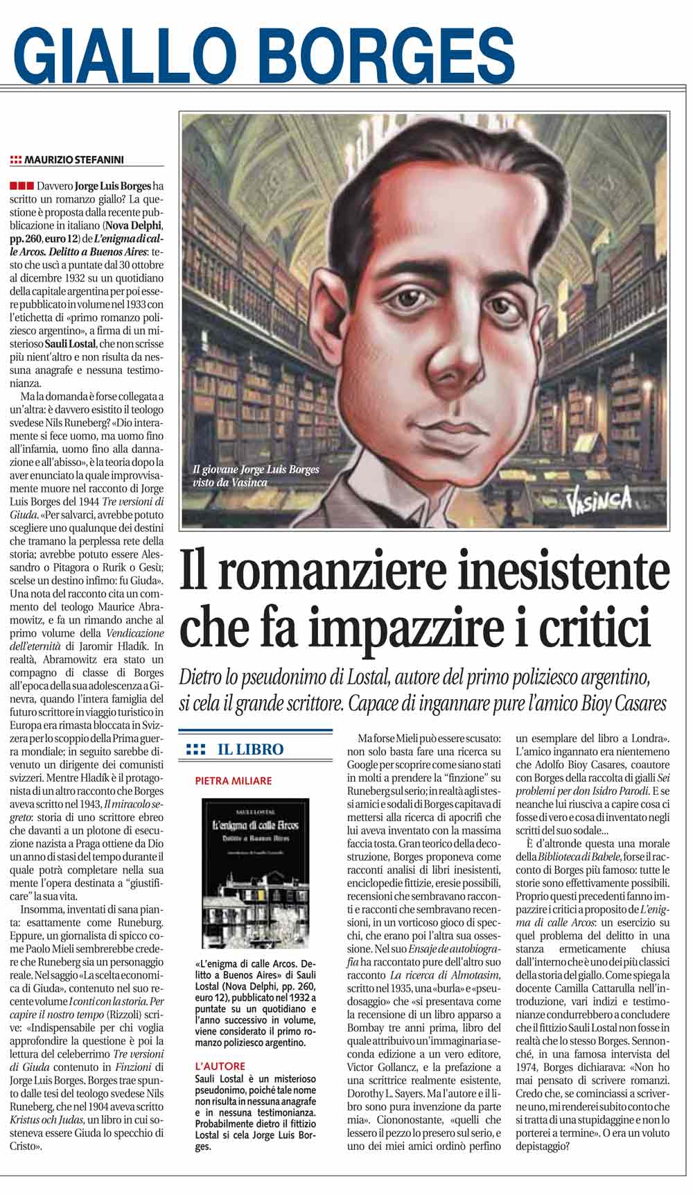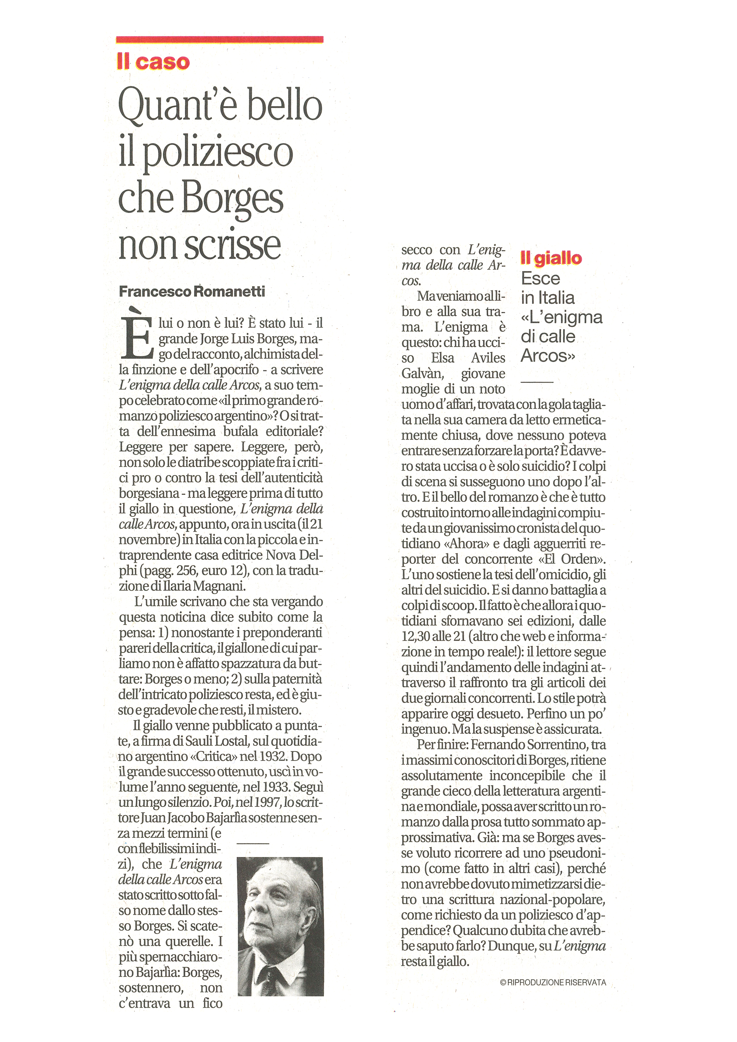 Il 29 ottobre 1932 sui giornali di Buenos Aires compare l’annuncio: “‘Critica’ pubblicherà il romanzo poliziesco più da brivido che si possa immaginare […]. A partire da un avvenimento che qualche tempo fa ha profondamente scosso l’opinione pubblica di questa città, l’autore ha costruito una storia toccante, intitolata El enigma de la calle Arcos…” L’anno successivo “il primo grande romanzo poliziesco argentino” usciva in volume. Ma chi ne era l’autore? Chi si nasconde sotto lo pseudonimo di Sauli Lostal? Nel 1997 lo scrittore argentino J. J. Bajarlia dalle pagine del popolare quotidiano “La Nación” afferma che Ulyses Petit de Murat, condirettore in quel periodo insieme a Jorge Luis Borges della “Revista Multicolor de los Sábados”, gli ha confidato che l’autore del romanzo è lo stesso Borges. “Borges – ricorda de Murat – lo scriveva a macchina dedicandogli un paio d’ore al giorno, con lo scopo di cimentarsi nel genere poliziesco.” Fernando Sorrentino, anch’egli scrittore, dalle pagine del “Clarín” nega che ciò sia possibile: “Borges non sapeva battere a macchina e non ha mai scritto un romanzo” afferma. La polemica s’infiamma e c’è addirittura chi sostiene che Sauli Lostal fosse in realtà Luis Stallo, un barbiere di origine italiana. La questione rimane aperta. Intanto nell’impeccabile Bibliografia completa di Borges redatta da Nicolas Heft L’enigma viene annoverato tra le sue opere.