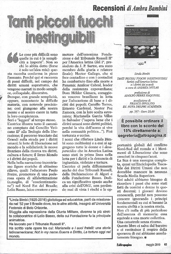 Linda Bimbi (1925-2016), glottologa ed educatrice ha insegnato all'Università federale di Belo Horizonte in Brasile. Sfuggita alla repressione della giunta militare, è stata la più stretta collaboratrice di Lelio Basso, col quale ha collaborato al Tribunale Russel II e la principale animatrice della Fondazione internazionale Lelio Basso di cui è stata segretaria internazionale e fondatrice della scuola di giornalismo. |