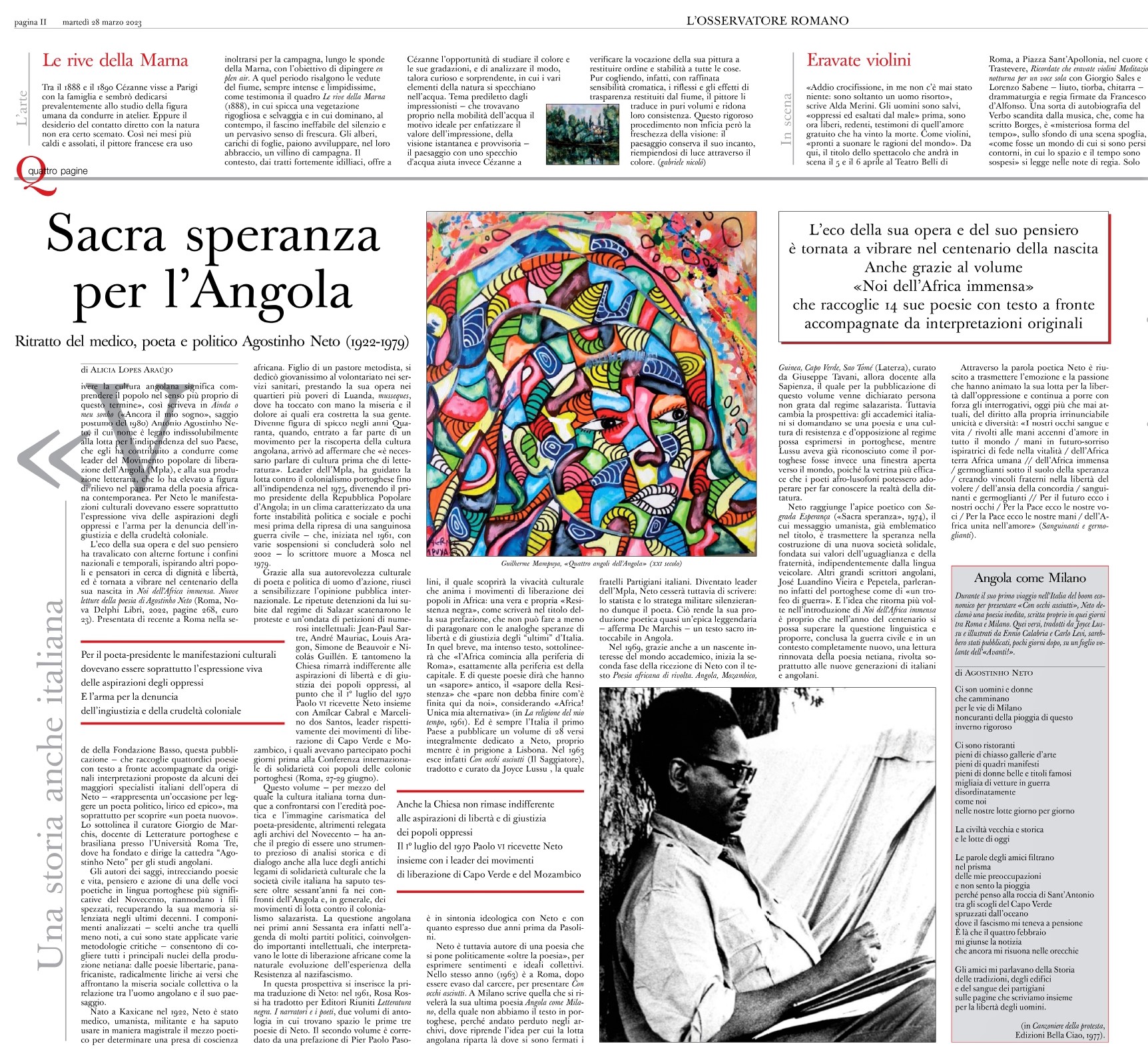 Nel centenario della sua nascita, la cultura italiana torna a confrontarsi con la poesia di Agostinho Neto (1922-1979), leader del processo di indipendenza dell’Angola ma anche una delle voci poetiche in lingua portoghese più significative del Novecento. Nata in una fase in cui un’intera generazione di militanti esprimeva il proprio impegno politico anche mediante un’intensa attività culturale, la poesia netiana, pur essendo letteratura militante, veicolo di valori in grado di sovvertire il sistema coloniale, non si piega, non si pone al servizio di un’ideologia. Piuttosto crea modelli di linguaggio e di visione, smaschera e sovverte la correlazione di fatti imposta dal colonialismo, elabora modelli estetico-etici indispensabili per un progetto d’azione e dà voce a ciò che è senza voce. Questa pubblicazione, come sottolinea il curatore nell’introduzione, rappresenta un’occasione per leggere un poeta politico, lirico ed epico ma soprattutto, grazie alle originali interpretazioni proposte da alcuni dei maggiori specialisti dell’opera di Agostinho Neto, offre ai lettori italiani la possibilità di scoprire un poeta nuovo.
